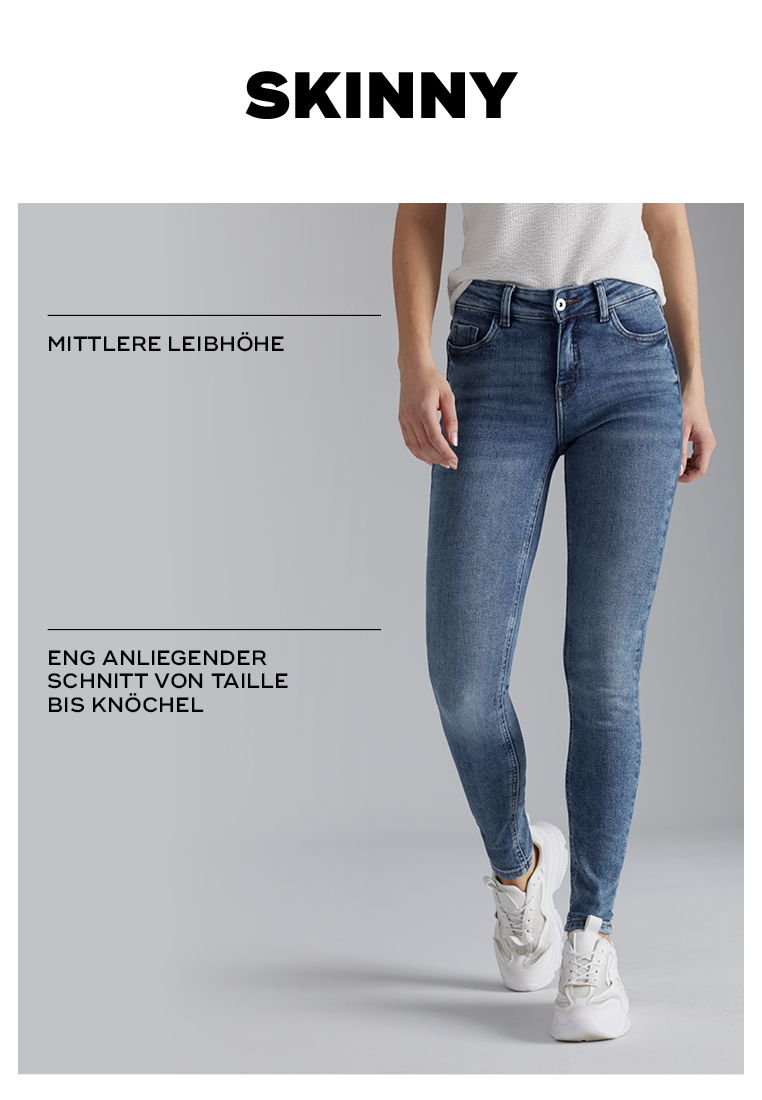 - Meistens sind Skinny-Jeans in mittlerer Leibhöhe erhältlich.