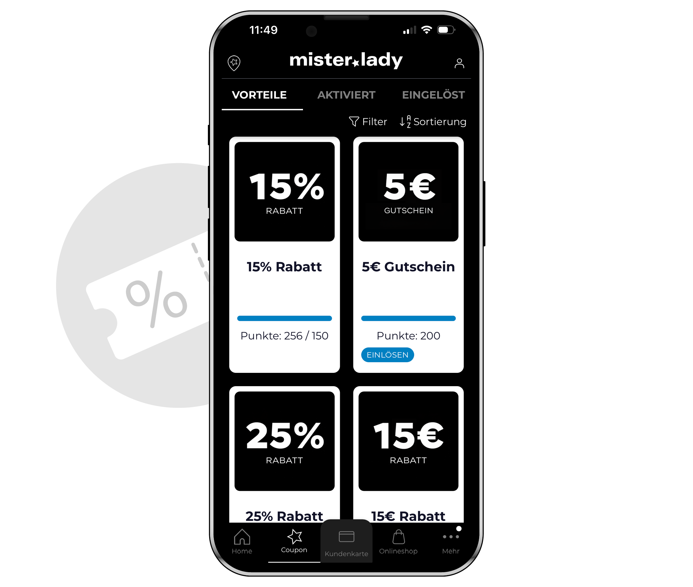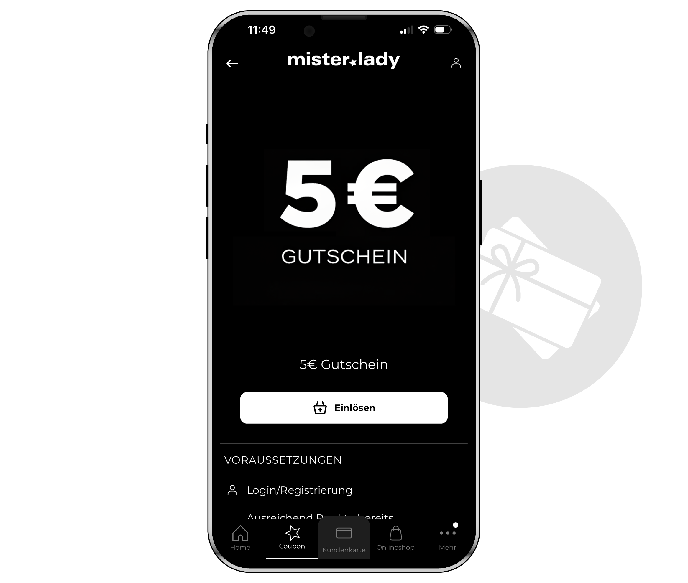 - Coupons auswählen: Entscheide dich für die mister*lady-App und profitiere von Rabatt-Coupons sowie Geschenk-Gutscheinen.